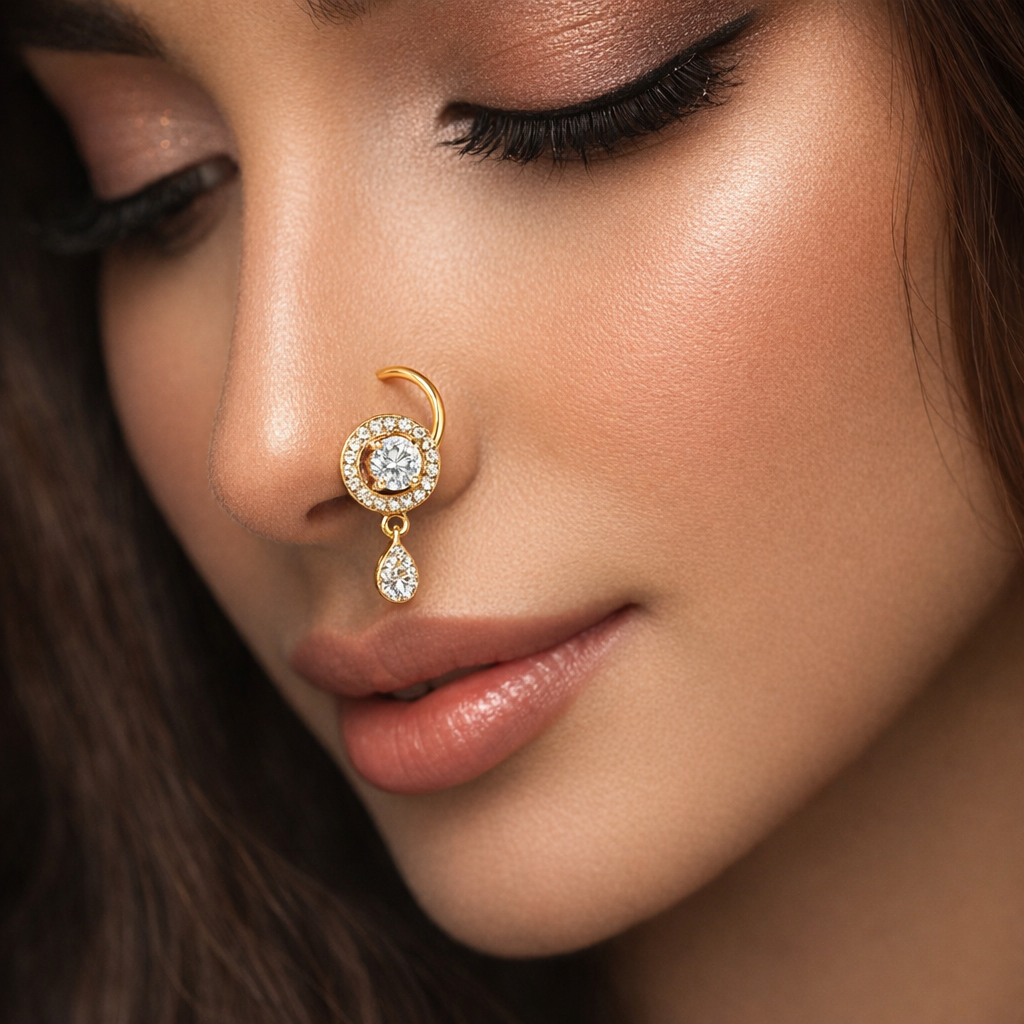 This jewellery piece is a luxurious gold nose ring designed to blend elegance with delicate sparkle.