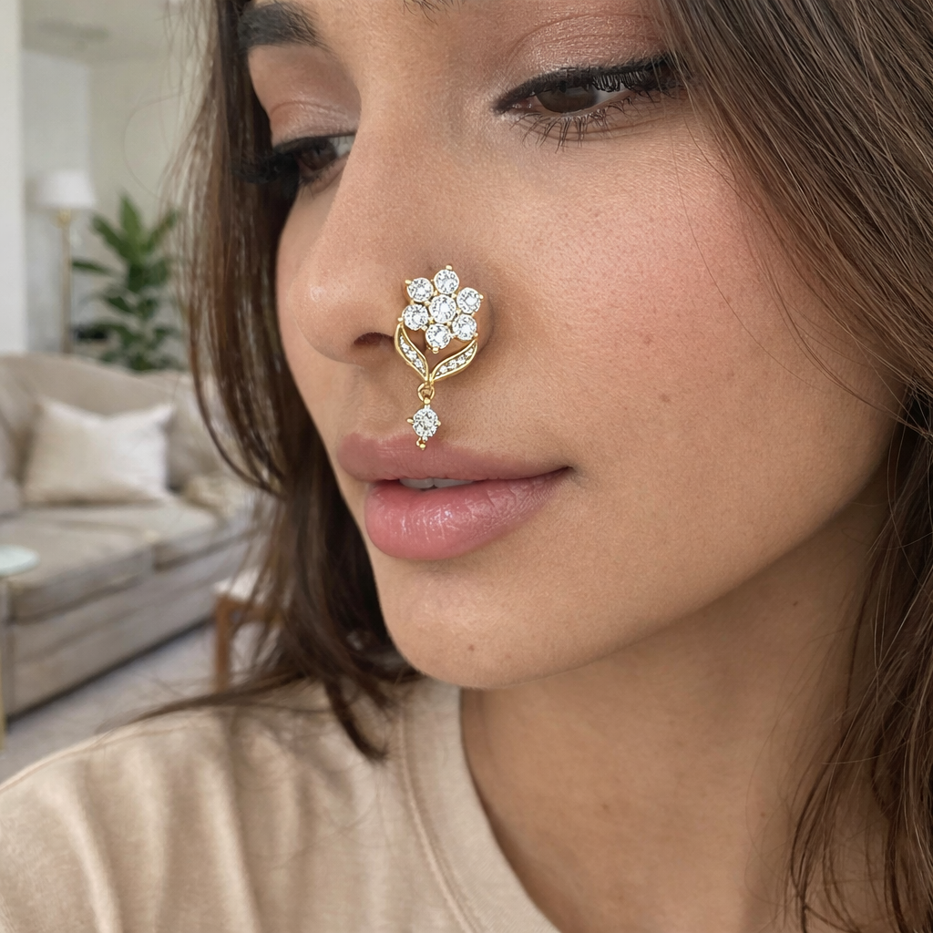 Graceful and radiant, this nose ring is inspired by a blooming flower in full sparkle. At its heart sits a floral cluster of brilliant round diamonds, carefully arranged like delicate petals to create a luminous centerpiece. Fine accent diamonds trace the elegant gold curves below, leading to a single dangling diamond that adds gentle movement and shine.