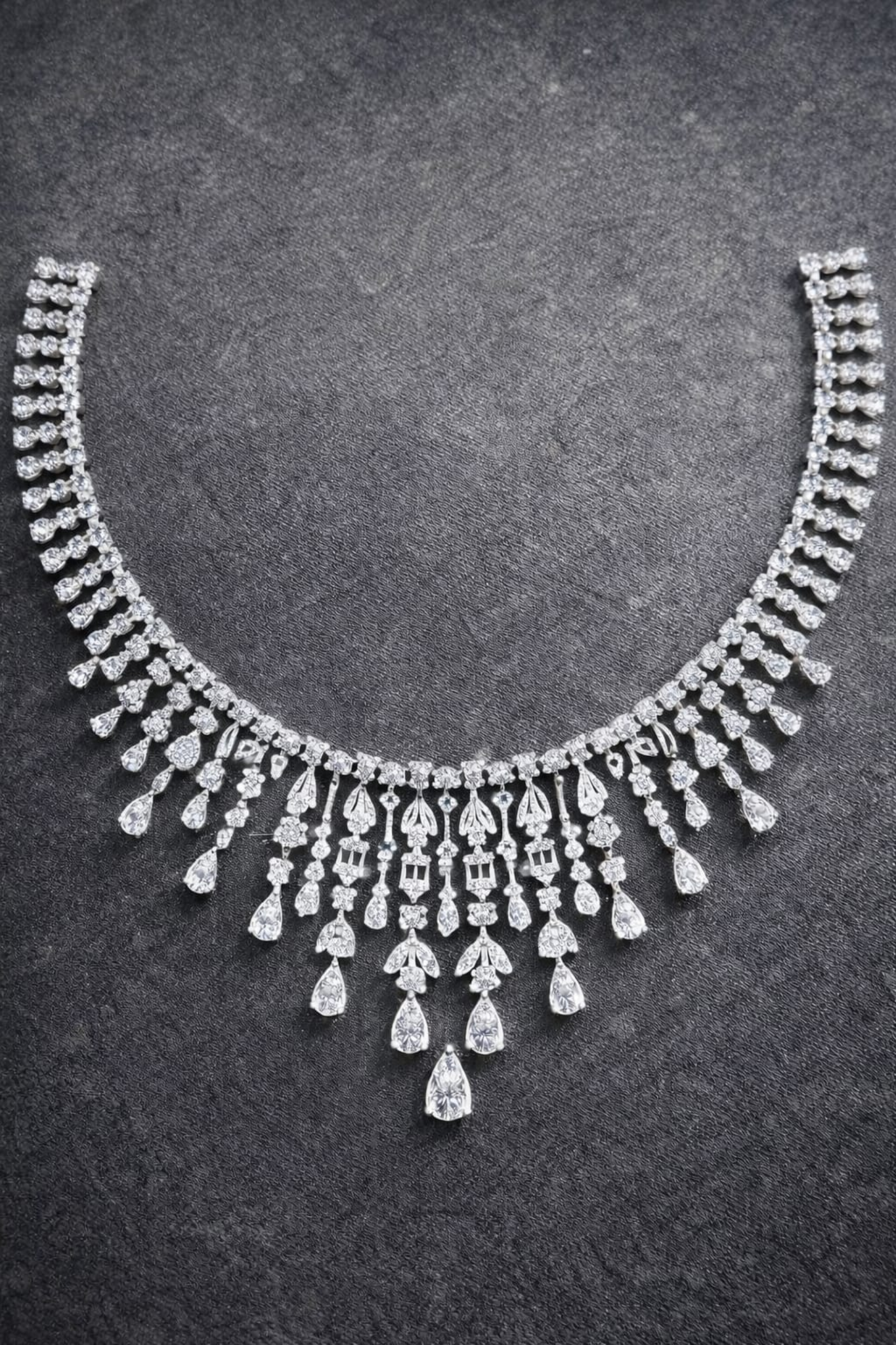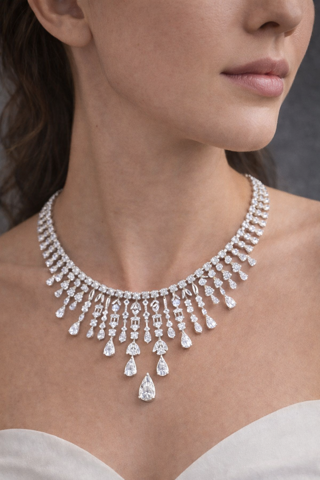 The Aurevella Celestara Cascade Necklace is a breathtaking statement piece designed to capture elegance and brilliance. Featuring a graceful arrangement of lab-grown diamonds, this necklace showcases a cascading pattern of sparkling stones that flow beautifully along the neckline. The delicate drop-shaped diamonds create a luxurious chandelier effect, adding movement and radiant sparkle with every step. Crafted with exceptional precision and refined detailing, this necklace embodies timeless sophistication and modern luxury, making it the perfect choice for weddings, celebrations, and unforgettable occasions.