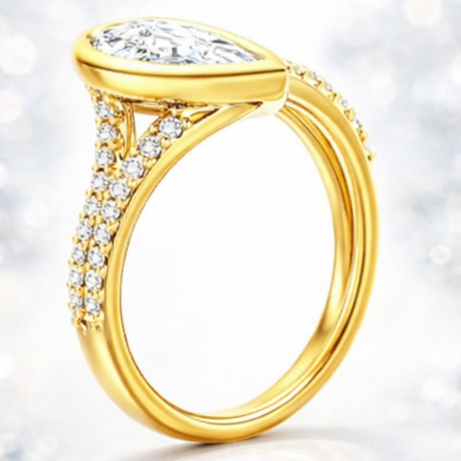 Gracefully sculpted to symbolize modern romance, the Aurevella Élan Pear Bypass Ring is a statement of refined elegance and contemporary luxury. At its heart lies a captivating pear-shaped diamond, encased in a smooth, high-polish 18K yellow gold bezel that enhances its brilliance while offering a sleek, sophisticated finish.