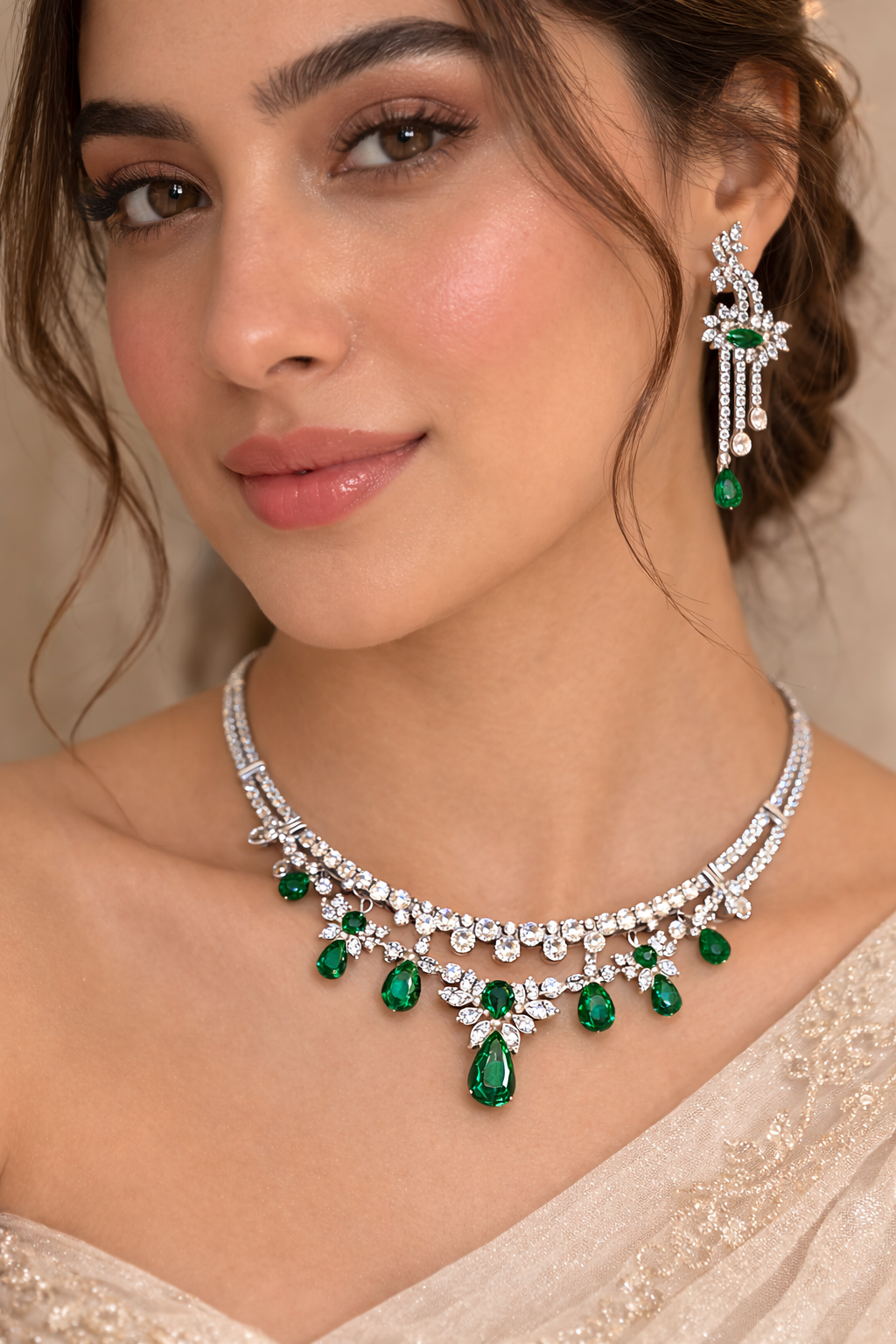 At the center of the necklace lies an intricately designed diamond structure that flows seamlessly across the neckline. Rows of shimmering stones create a radiant framework that enhances the brilliance of the piece. The necklace gracefully descends into a series of delicate emerald drops that create a stunning cascading effect. Each emerald-shaped stone is carefully placed to add depth, color, and movement, giving the necklace a luxurious and captivating appearance.