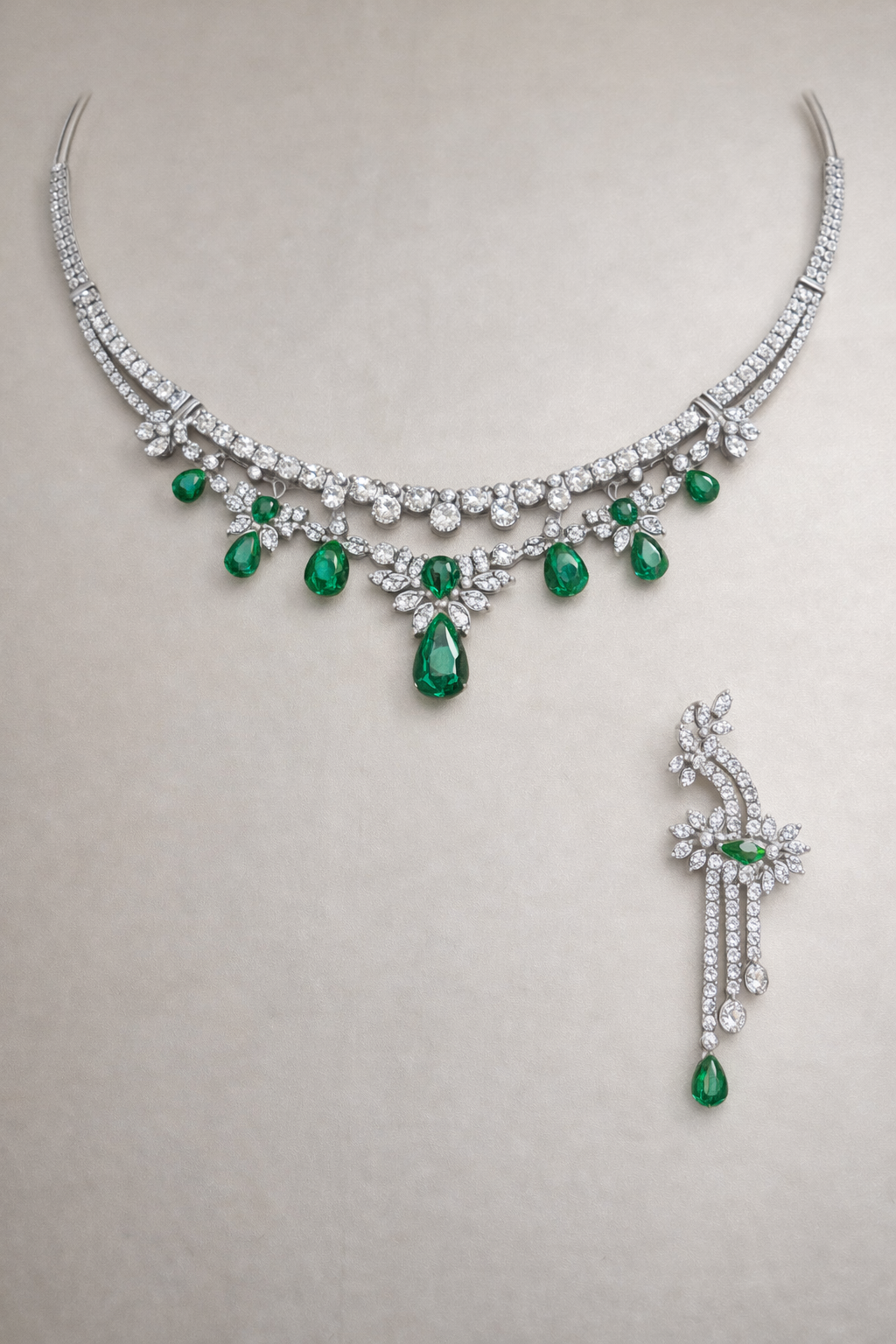 Completing the set are the matching drop earrings, designed to mirror the necklace’s elegant motifs. The earrings feature a delicate arrangement of diamonds that gracefully flow into cascading diamond strands and a stunning emerald drop. This harmonious design ensures the entire set maintains a cohesive and sophisticated look.