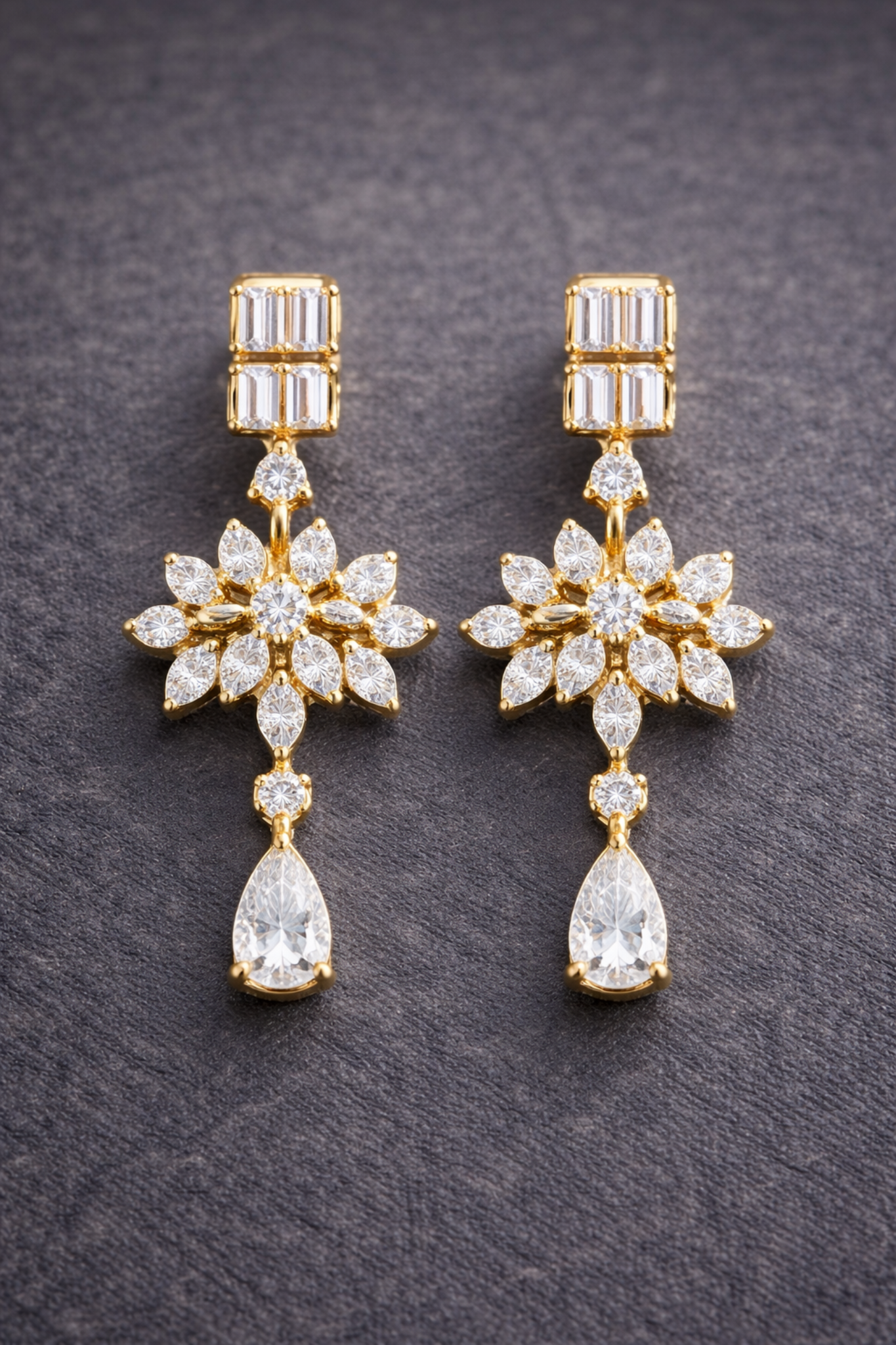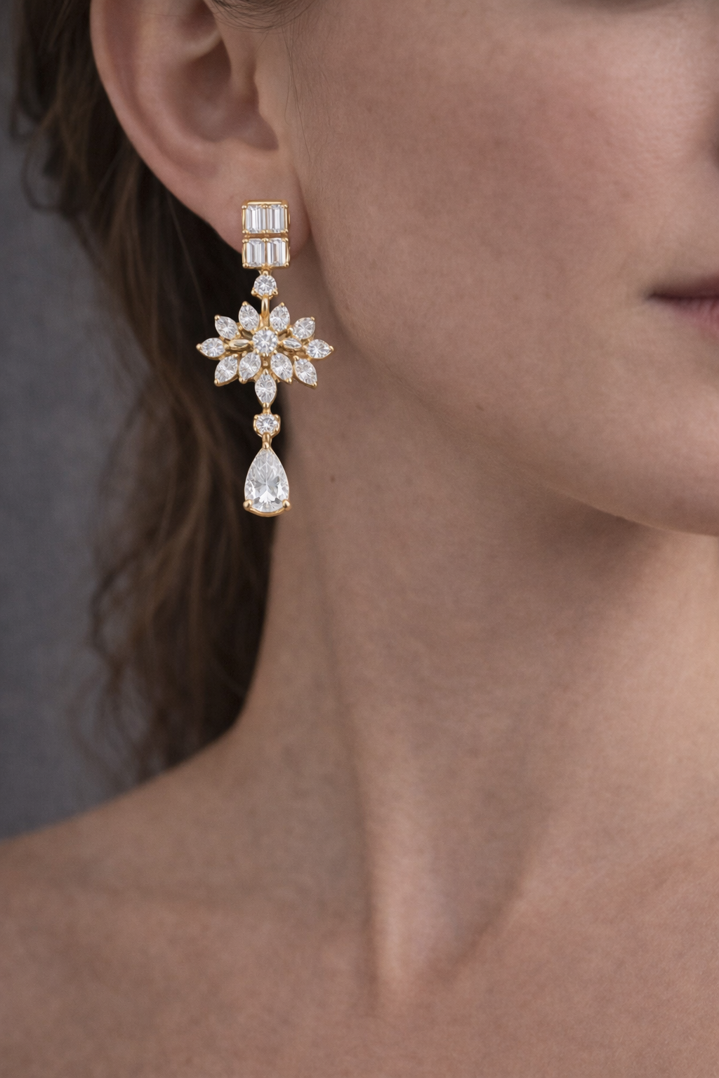 Completing the earrings is a captivating pear-shaped diamond drop that gently dangles below the floral cluster. This drop element adds movement and a refined chandelier-like charm, allowing the diamonds to shimmer beautifully with every motion. The flowing design creates a perfect balance between classic sophistication and contemporary elegance.