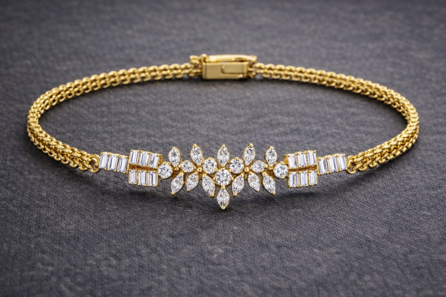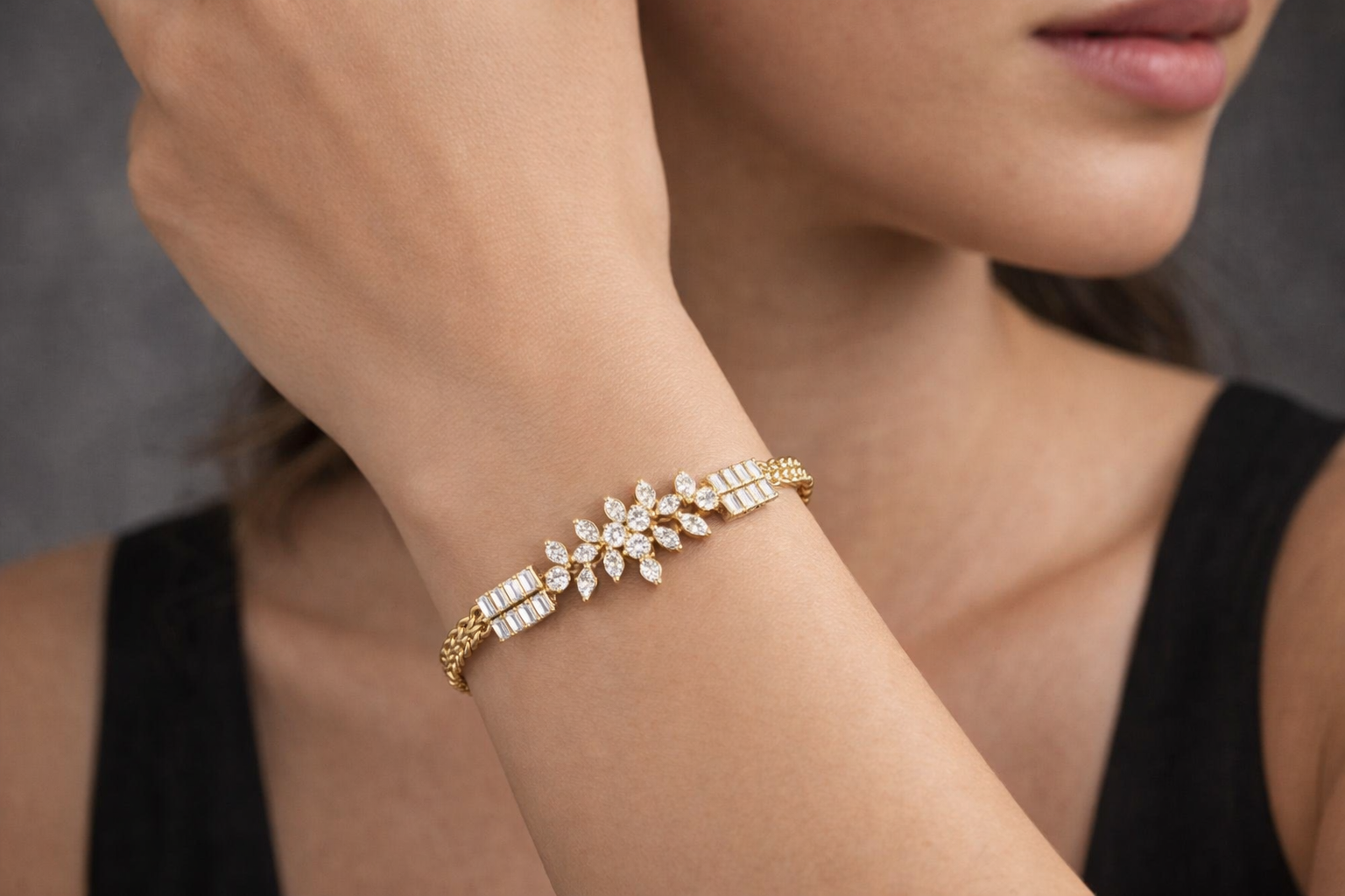 On each side of the floral centerpiece, sleek baguette-cut diamonds add a contemporary geometric touch, creating a perfect balance between classic charm and modern design. These sparkling stones are carefully arranged to enhance brilliance and reflect light from every angle, giving the bracelet a luminous and captivating appearance.