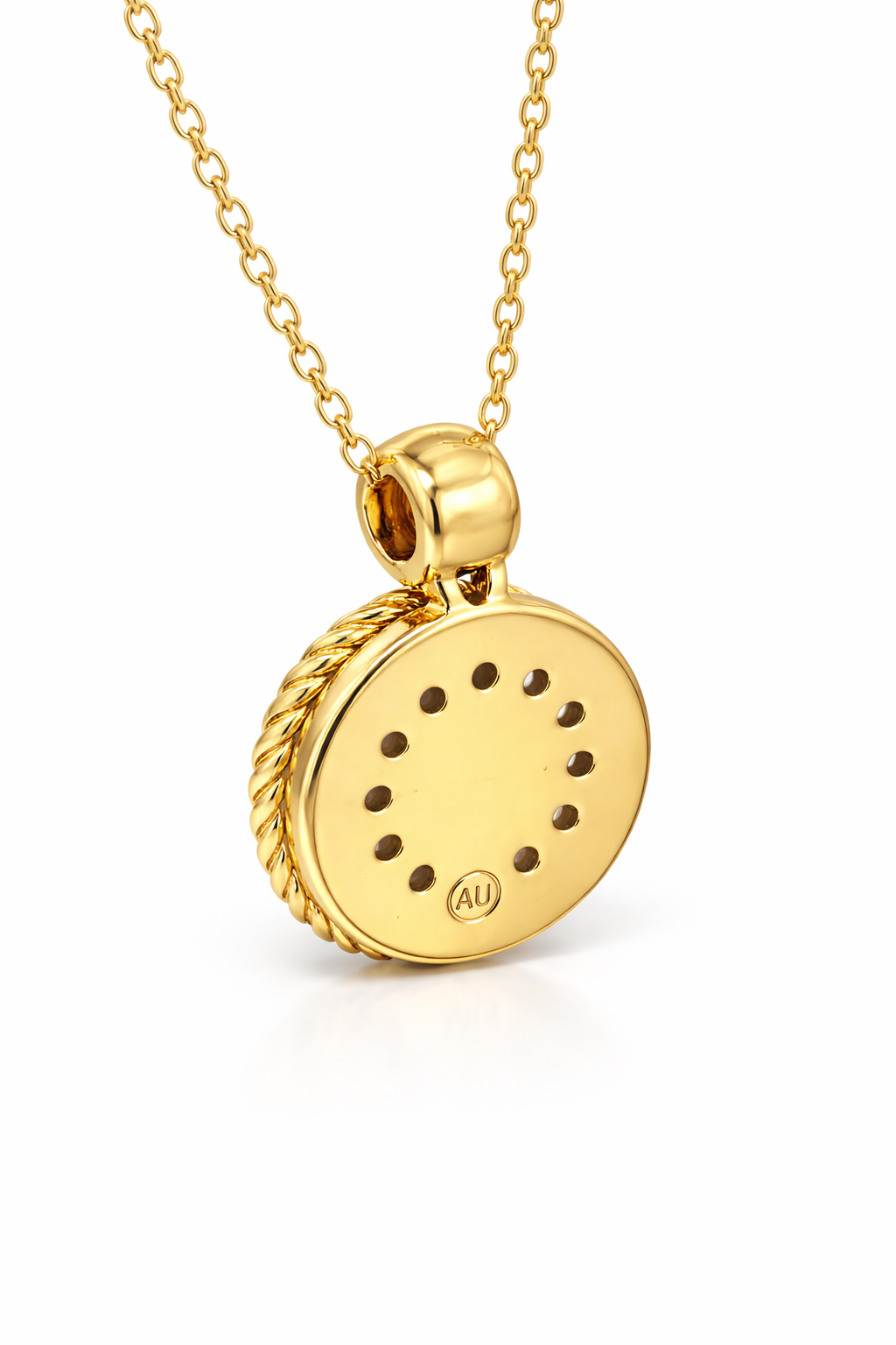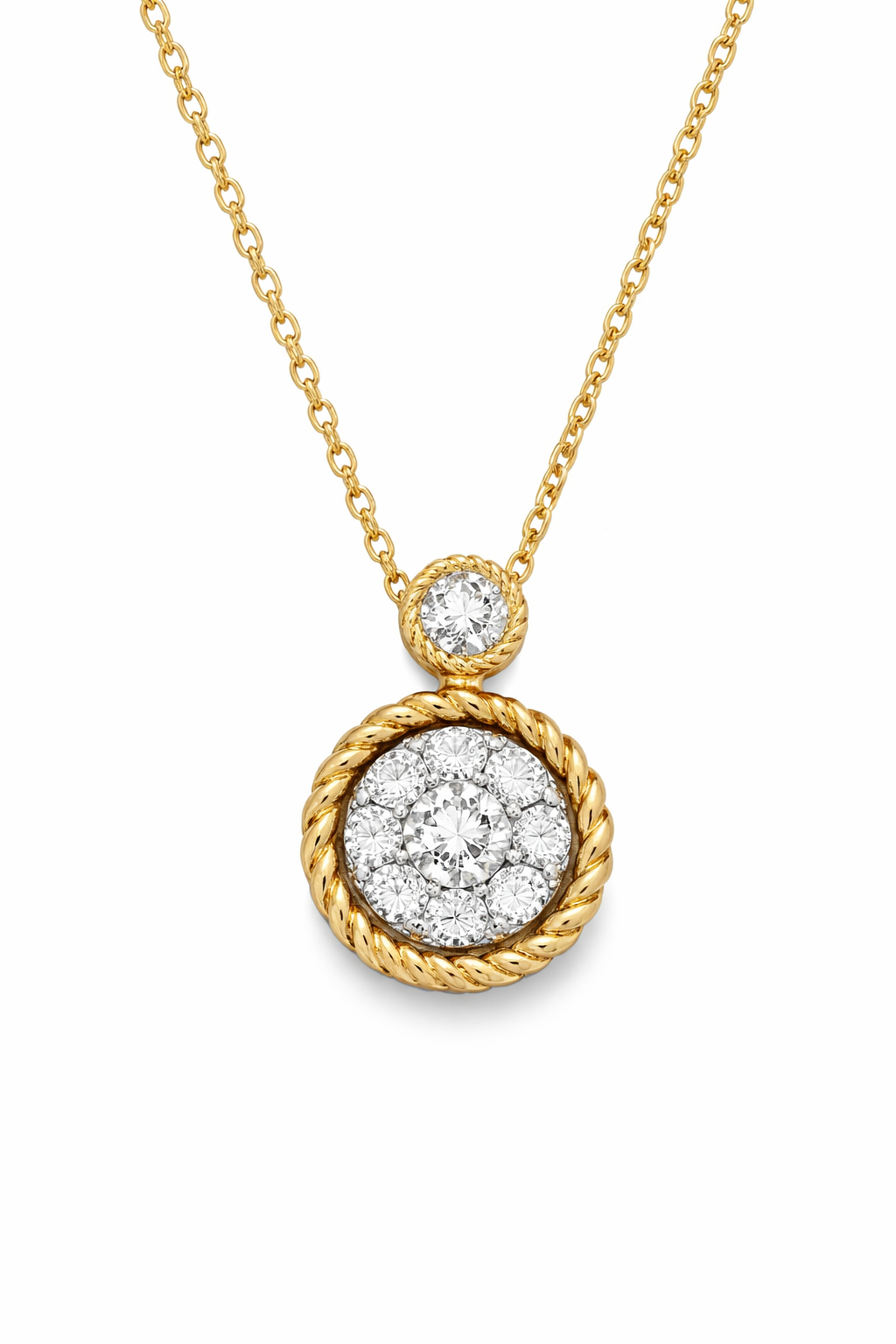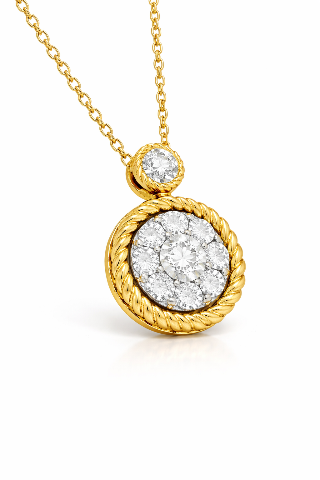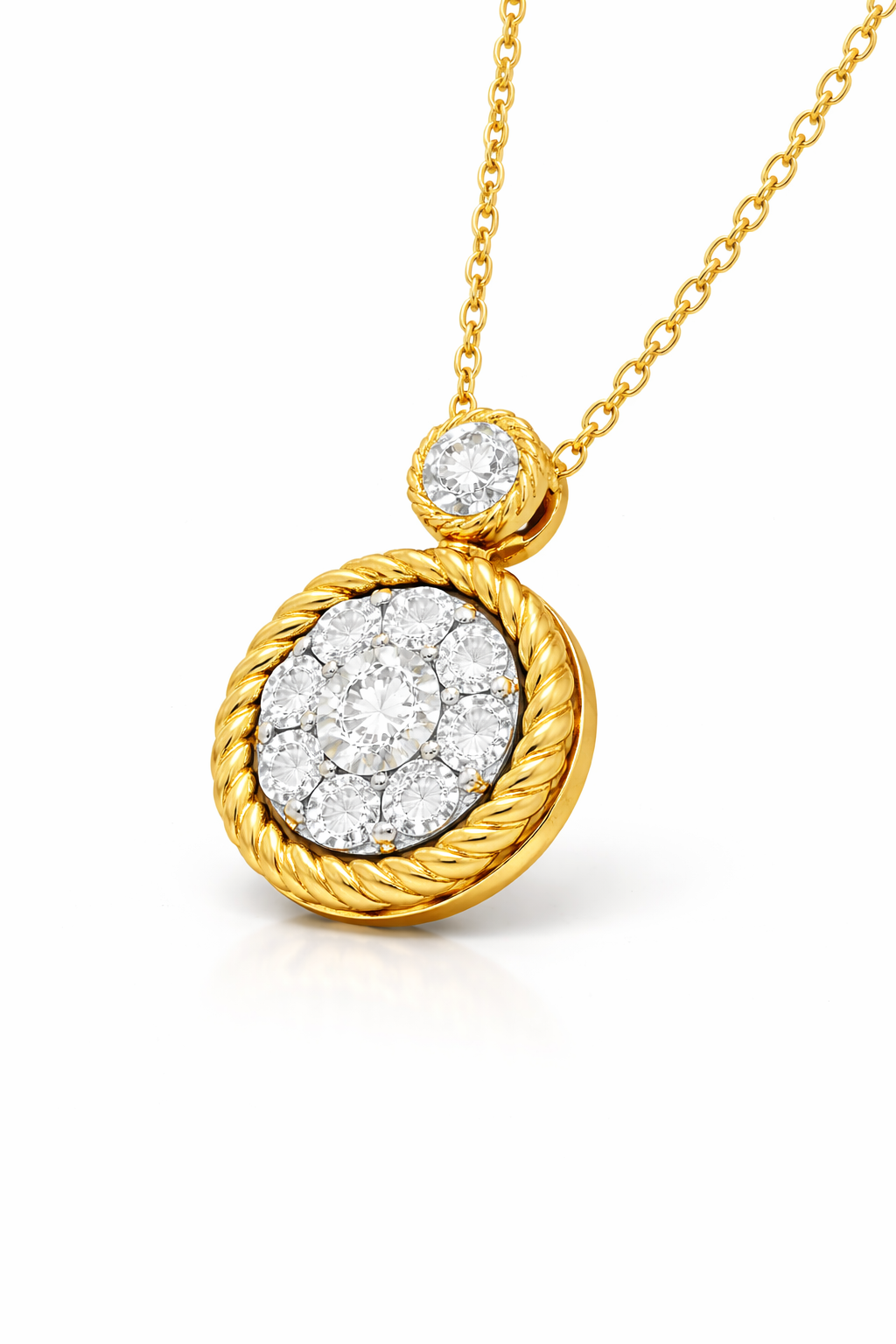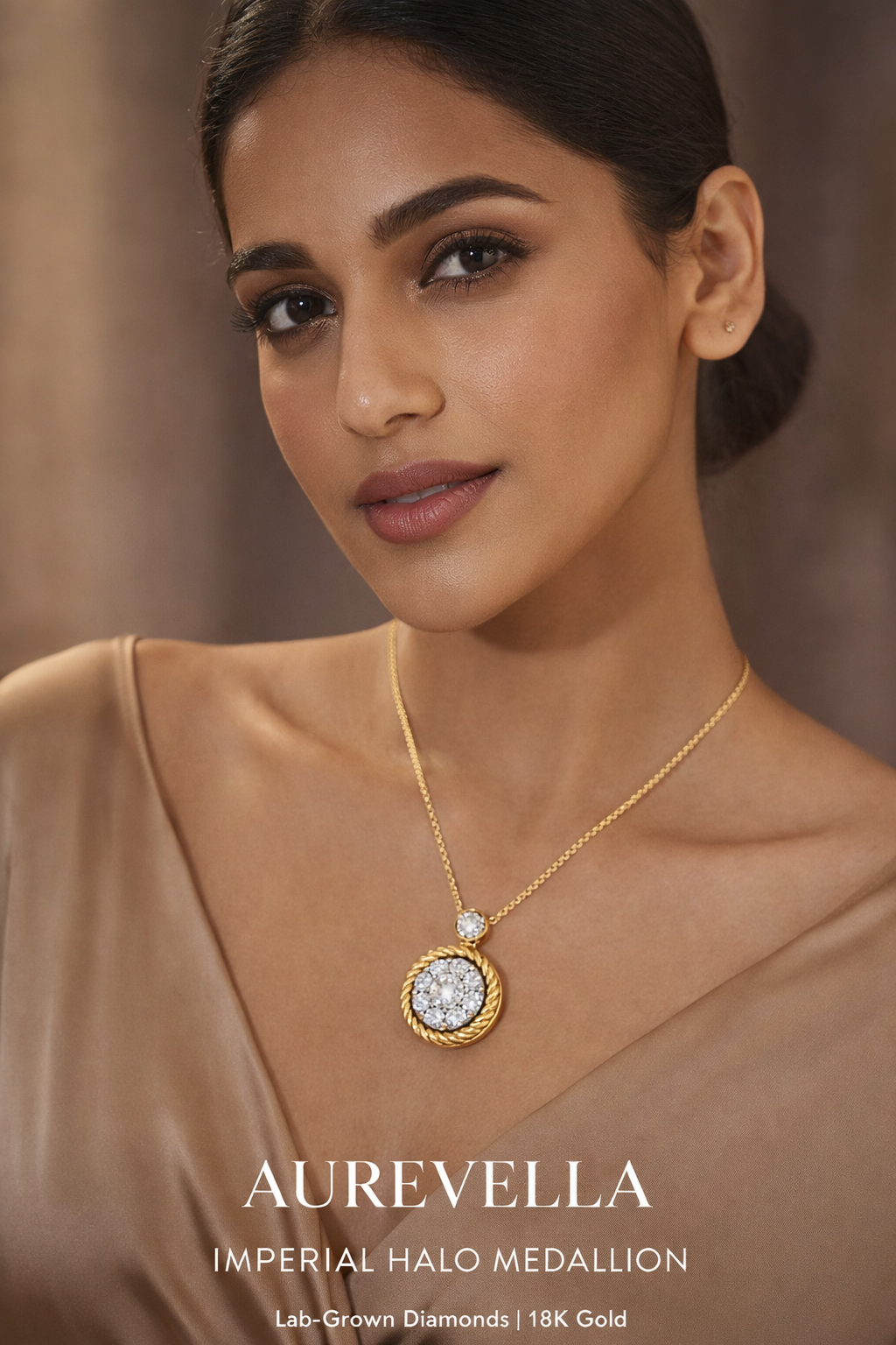 The Aurevella Imperial Halo Medallion is a statement of refined royalty and enduring sophistication. Designed with a striking circular silhouette, this exquisite pendant showcases a luminous cluster of lab-grown diamonds at its heart, framed by a radiant halo and encircled with an intricately sculpted rope-textured gold border.