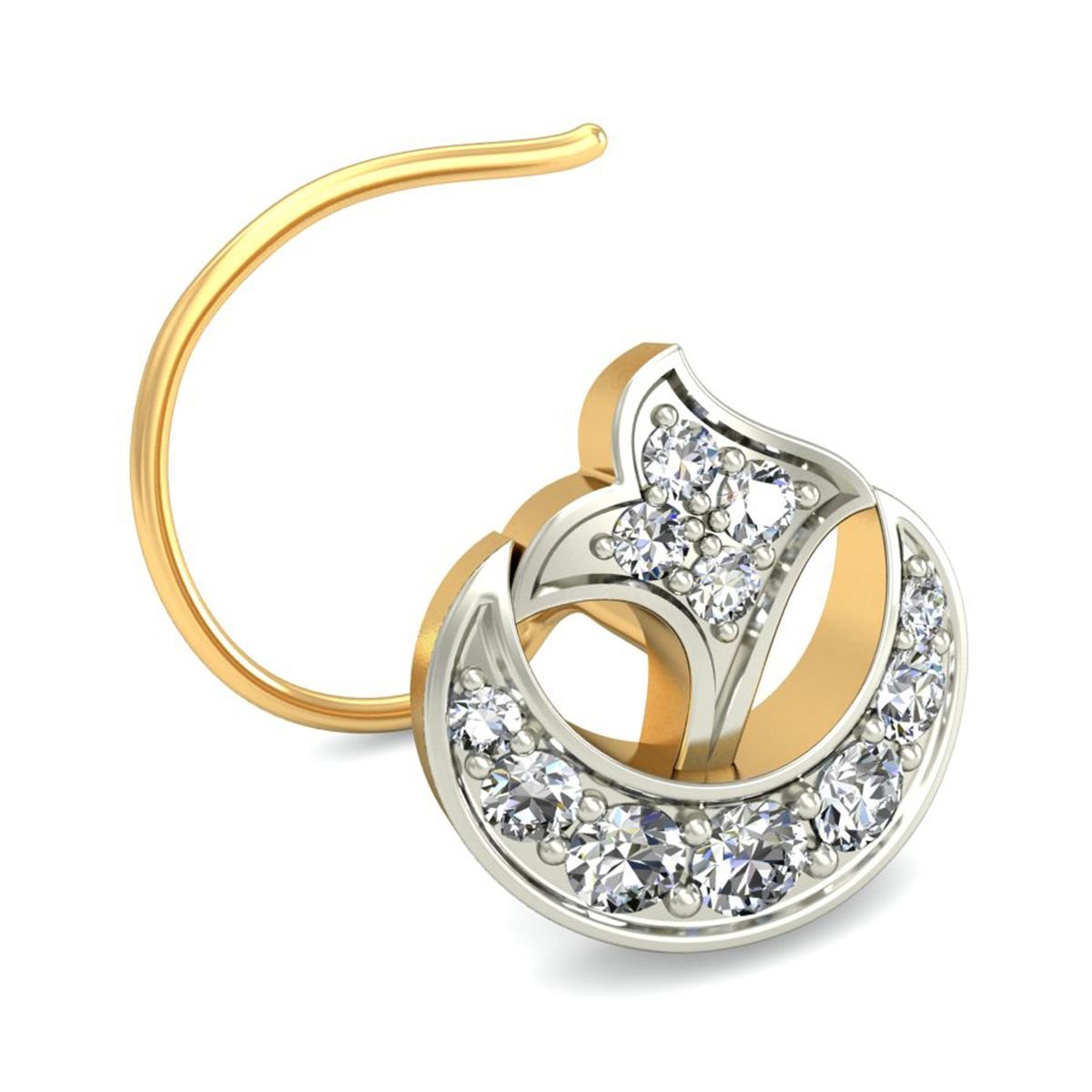 The Aurevella Celestial Crescent Nose Pin is a graceful blend of artistry and brilliance, designed to capture attention with its luminous charm. Sculpted in a delicate crescent silhouette, the piece is adorned with shimmering diamonds that reflect light beautifully, creating a radiant halo effect. At its center, a refined motif adds dimension and elegance, while the gentle pearl drop introduces a soft, timeless touch.
