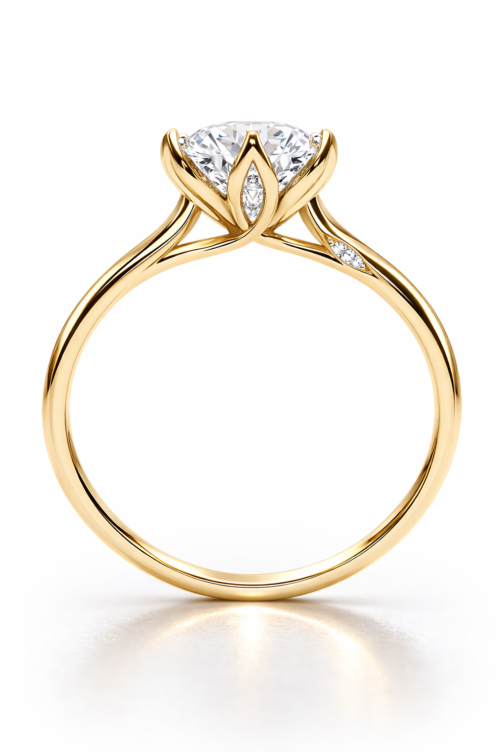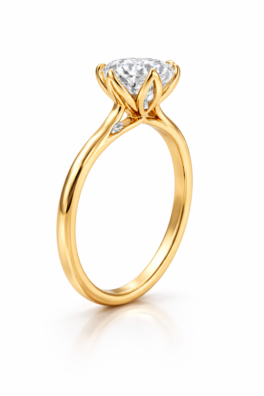 Crafted in luminous 18K gold, the slender, polished band offers a minimal yet sophisticated foundation that highlights the intricate crown design. The petal embrace structure not only secures the diamond gracefully but also creates a romantic blooming effect — symbolizing love unfolding in its purest form.