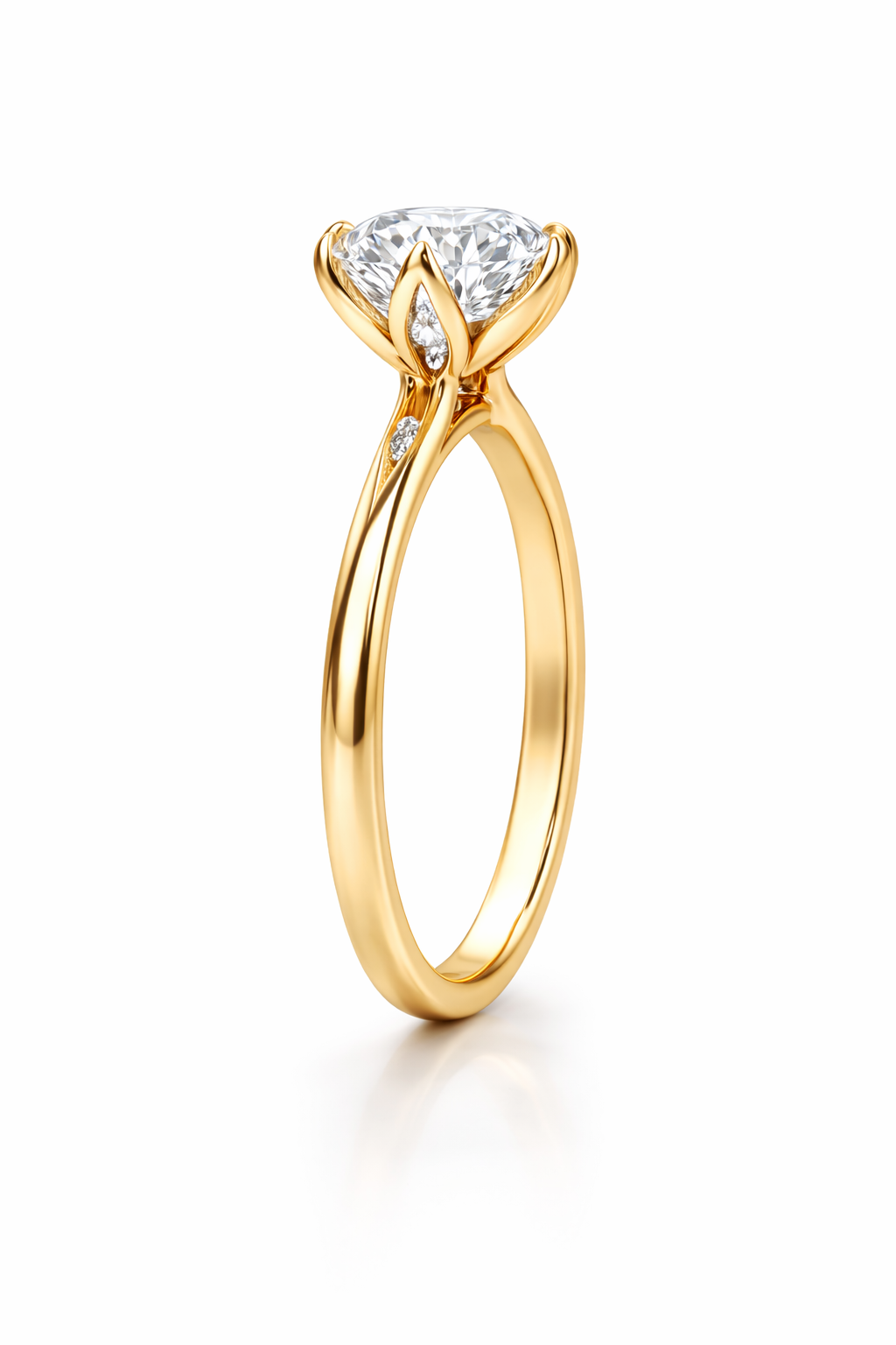 The Aurevella Marquise Petal Embrace is a celebration of delicate craftsmanship and enduring love. Designed with an artistic petal-inspired setting, this elegant solitaire ring features sculpted gold prongs that gently rise and curve around the center diamond, forming a soft marquise-shaped silhouette from the side profile. The open gallery allows light to flow beautifully through the stone, enhancing brilliance from every angle.