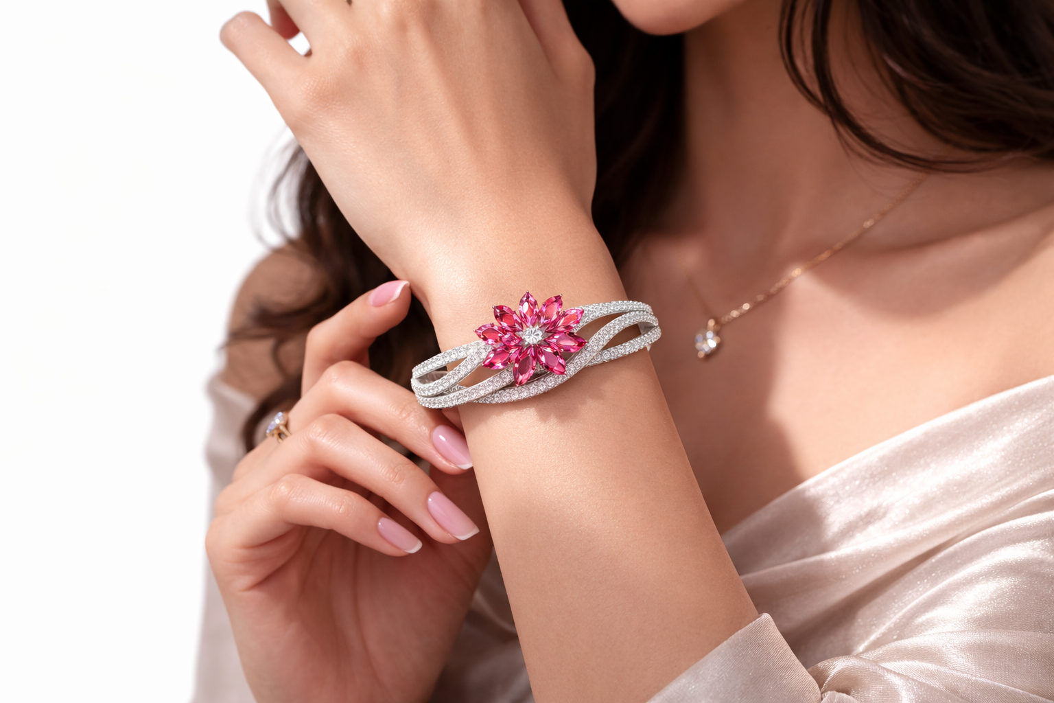 Crafted for the modern woman who appreciates artistry and grace, the Rosavine Bloom Bracelet seamlessly transitions from daywear to evening glamour. Whether paired with a minimalist outfit or an ornate ensemble, it adds a refined touch of romance and sparkle.