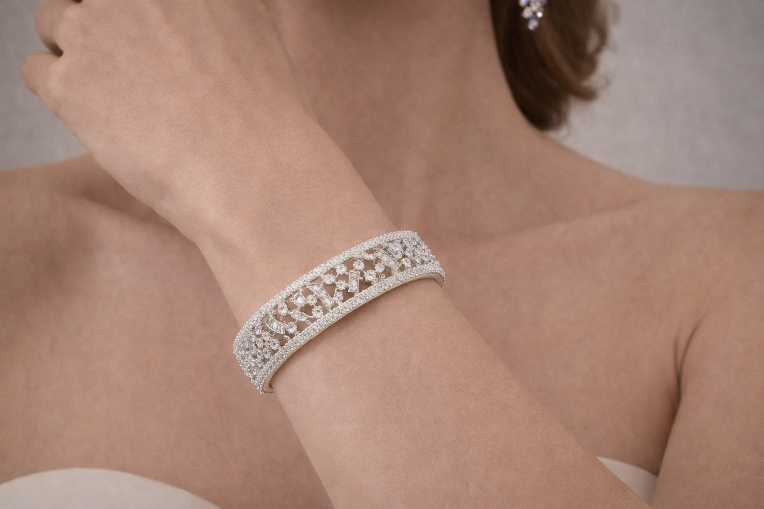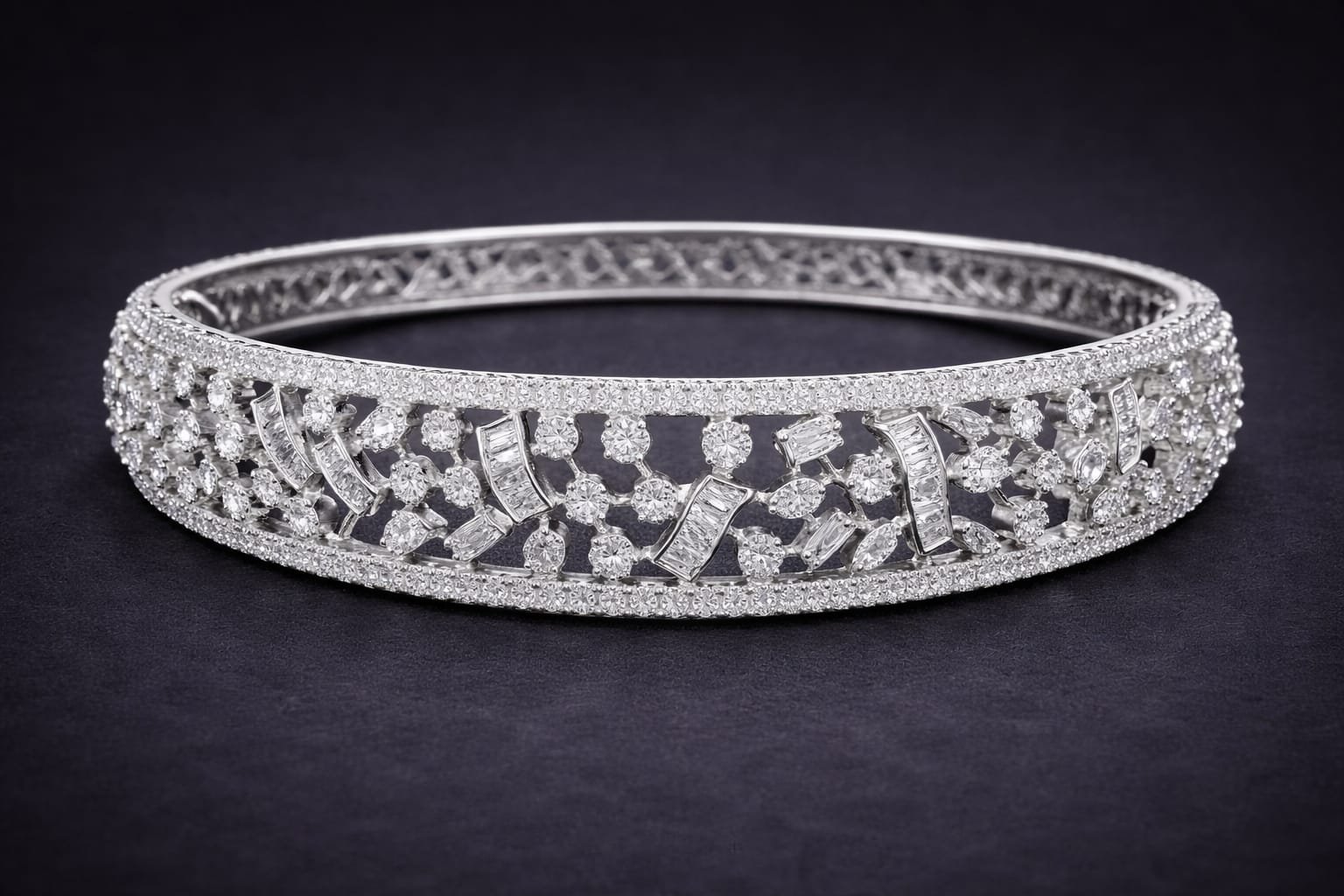 Encircling the intricate center is a finely pavé-set border, adding a seamless frame of brilliance while enhancing the bracelet’s structural elegance. The smooth inner finish ensures a comfortable fit, making it perfect for extended wear—whether for grand celebrations, evening soirées, or elevated everyday styling.