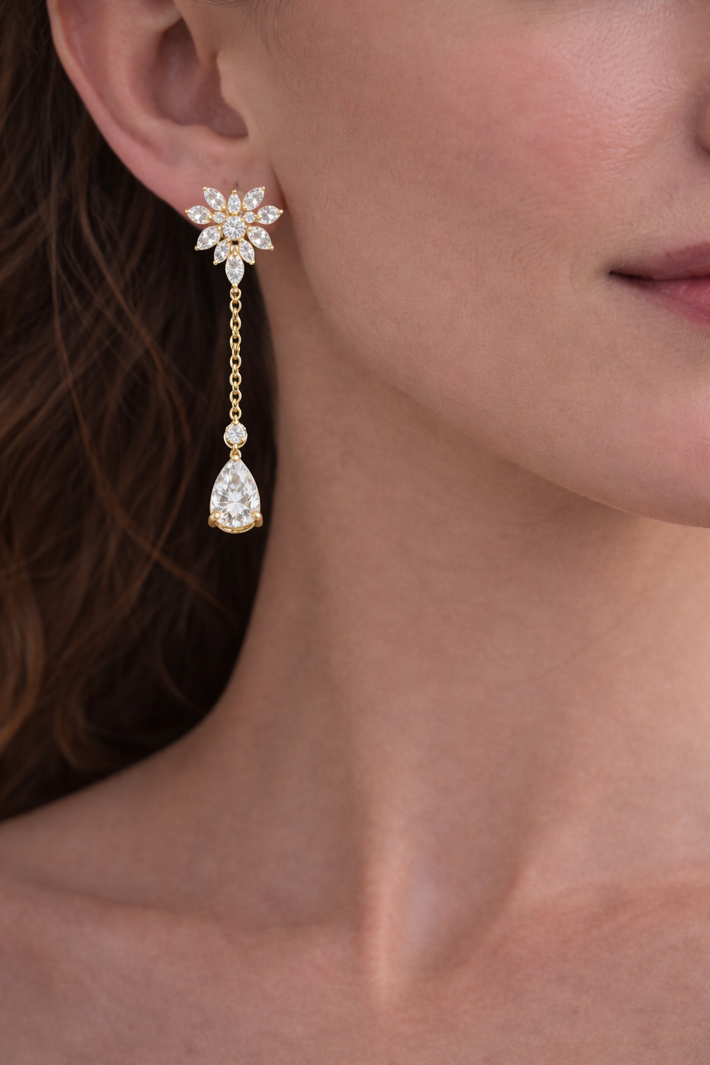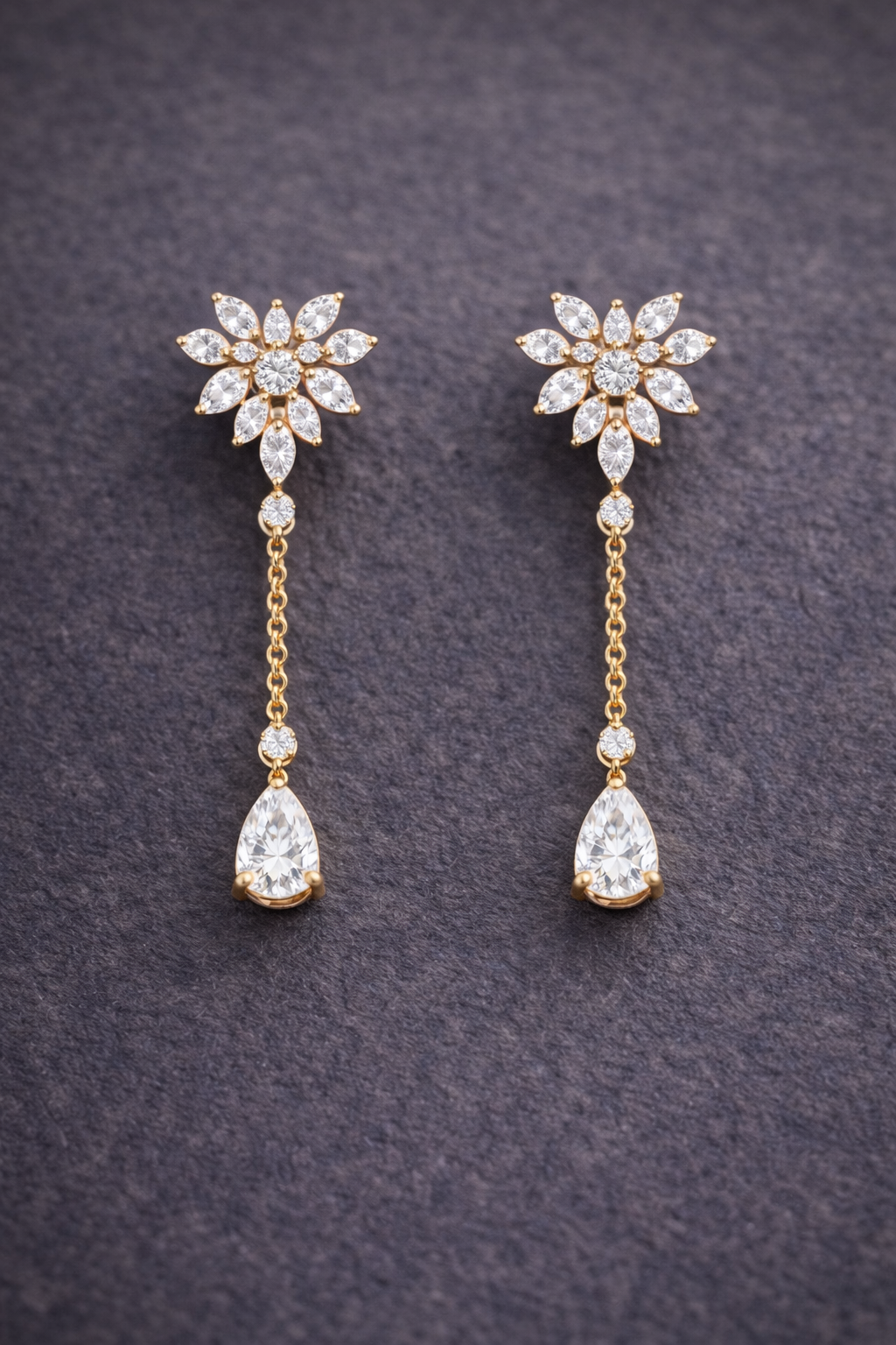 Extending gracefully from the floral motif is a delicate gold chain drop, adding movement and elegance to the overall design. The earrings are finished with a dazzling pear-shaped diamond drop that gently sways with every motion, capturing light and creating a soft, radiant glow. This cascading element gives the earrings a refined chandelier-like appeal while maintaining a light and sophisticated aesthetic.