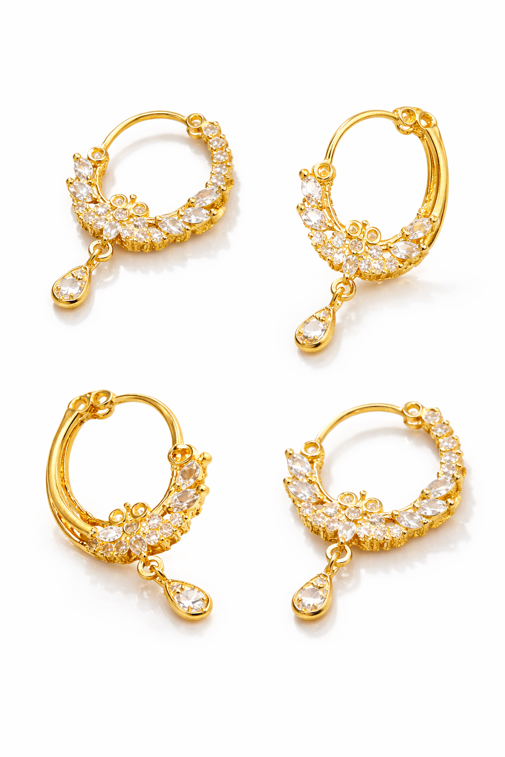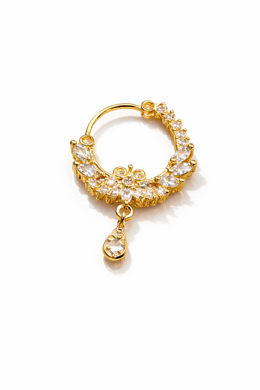 Crafted in radiant gold, the silhouette forms a graceful circular frame that rests elegantly against the skin. Along its lower crescent, a harmonious arrangement of marquise and round-cut stones unfolds like petals in full bloom. At the center, a floral-inspired motif adds intricate detailing, symbolizing beauty, growth, and elegance. Completing the design is a finely suspended teardrop charm that catches light with every subtle movement, adding softness and fluid sparkle.