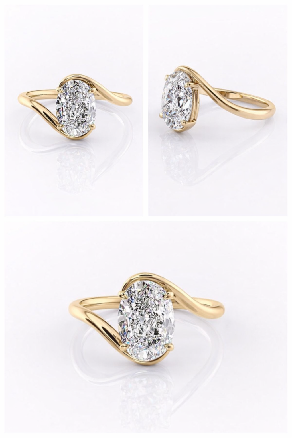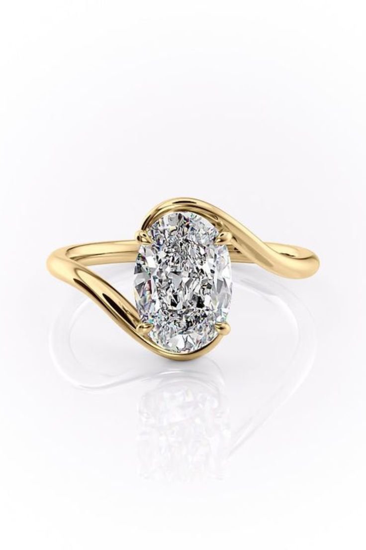 At its heart rests a dazzling oval diamond, secured in delicate prongs that allow maximum light reflection. The open, flowing gold silhouette enhances the diamond’s brilliance while adding a contemporary artistic touch. Its minimalist yet distinctive design makes it ideal for engagements, anniversaries, or as a statement of everyday luxury.