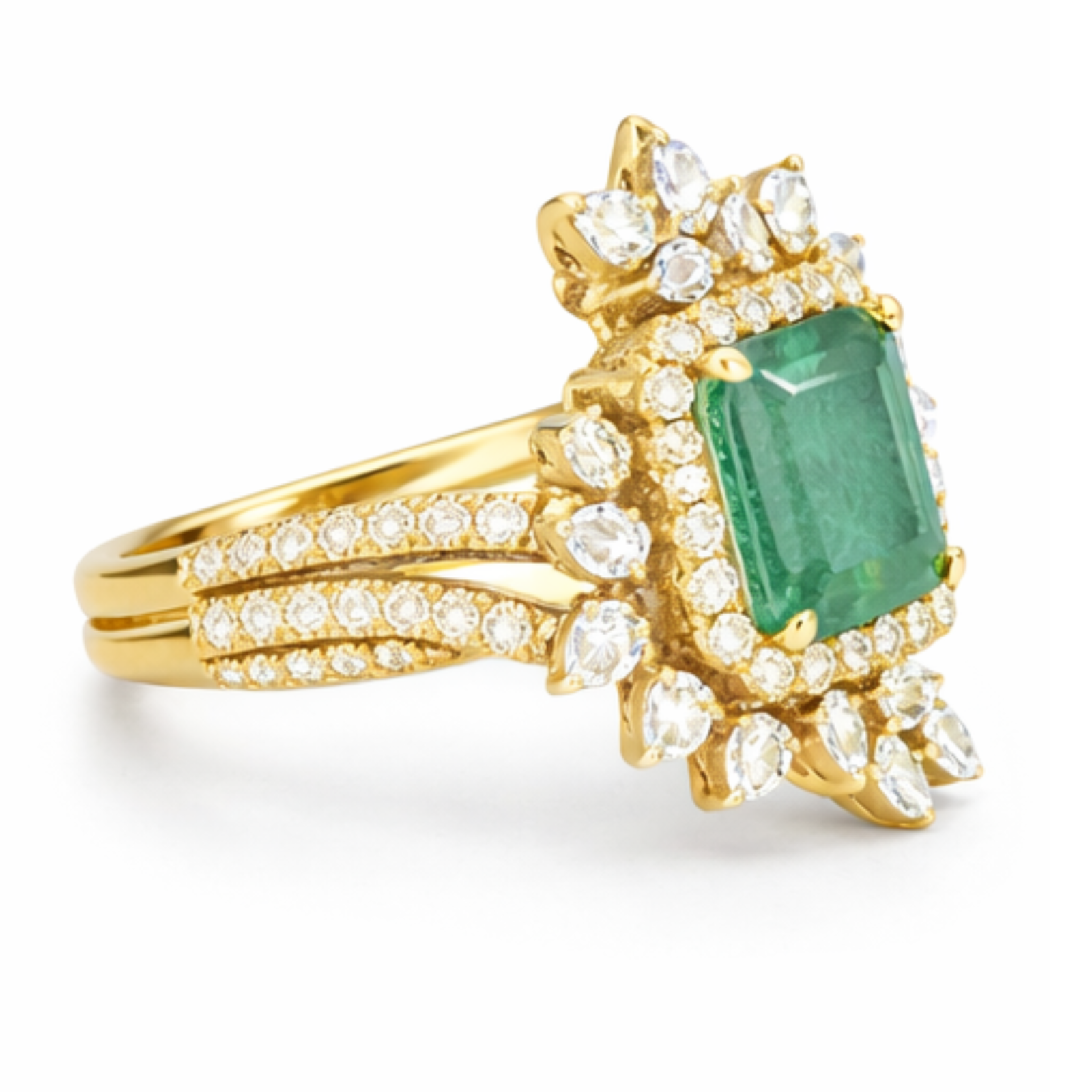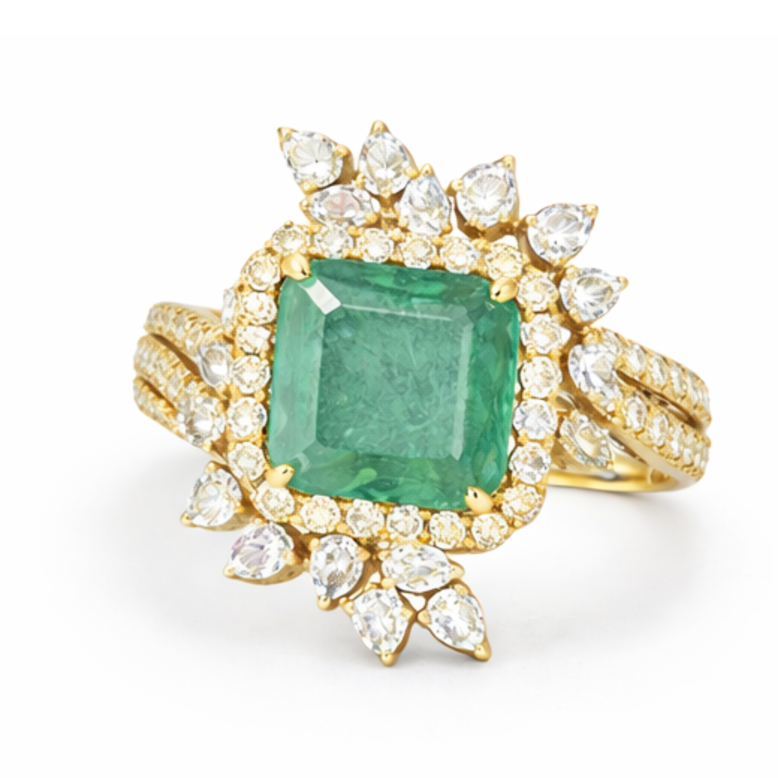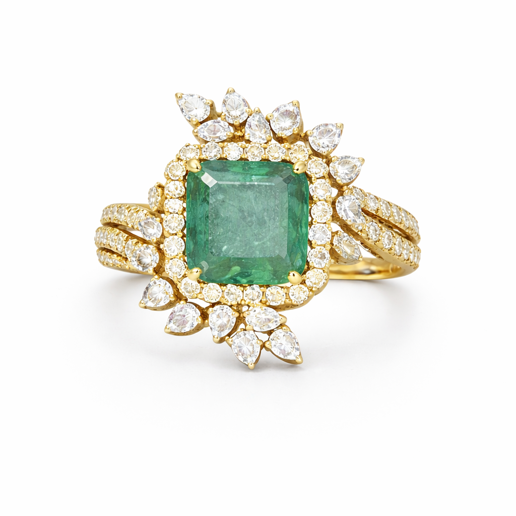 The Emerald Radiance Halo Ring is a striking celebration of color, brilliance, and craftsmanship. At its heart sits a captivating square-cut emerald centerpiece, framed by a luminous halo of round diamonds that amplify its rich green glow. Delicate pear-shaped diamond accents bloom around the halo, creating a floral-inspired silhouette that feels both regal and feminine.